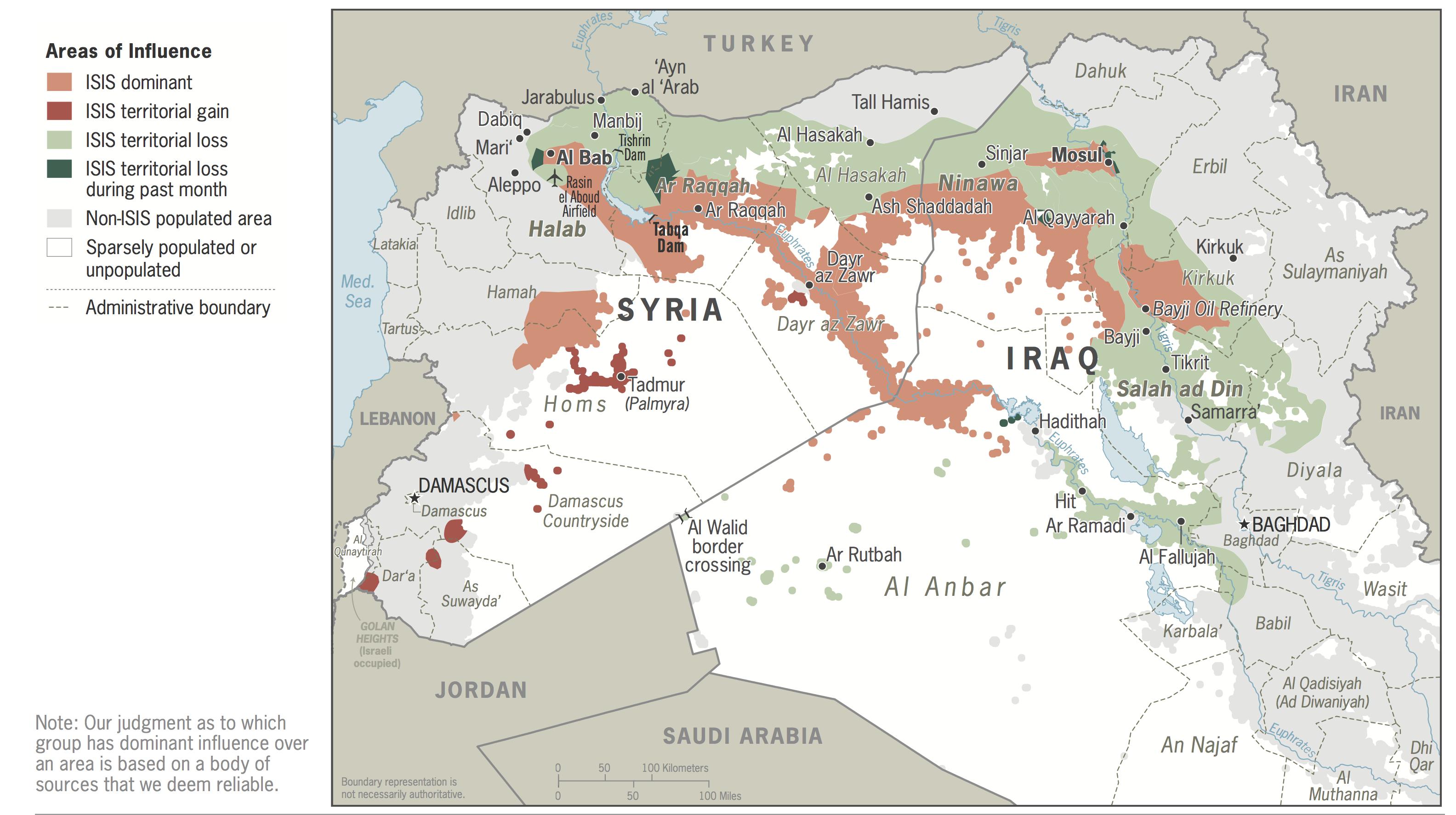 The map (below) depicts ISIS areas of influence, including its net territorial losses—35,000 to 36,000 square kilometers, or about 62 percent of the territory it had dominated in Iraq and 13,000 to 14,000 square kilometers, or about 30 percent of the territory it dominated in Syria—since August 2014. Daesh probably has a presence and freedom of movement in much of the unpopulated areas depicted on the map, but we cannot determine its level of influence in these areas. Our estimates are subject to change because of the dynamic nature of the conflict.