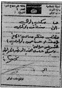الشكل 1: عام 2008، قامت قوات شركاء التحالف بالحصول على الدفاتر المالية في مخبأ لداعش. وربطت عينة من تحليل الدي ان أي الجنائي والتي عثر عليها من دفتر المالية الذي حصلت عليه التحالف وقوات الشركاء عام 2018 مشتاق للمخبأ الذي يحوي على هذه المستندات. وقامت قوات التحالف سابقًا باعتقال مشتاق عام 2007 في القائم، العراق، للاشتباه بتمويله للمتمردين. وتحوي هذه الرسالة على ختم رسمي لداعش بالإضافة إلى مذكرة مكتوبة بخط اليد وغير مؤرخة موقعة باسم “موظف الوالي” في الدولة الإسلامية، خلافة على منهج النبوة، ولاية الفرات” وتطلب من مشتاق مساعدة شخص آخر إتمام عملية تحويل الأموال.